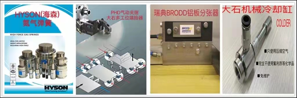 本公司是HYSON氮氣彈簧在中國的總代理,并提供管路設(shè)計及售后服務(wù)。同時還代理美國PHD氣動夾鉗、SWEDEN機器人平衡缸、美國LSP噴涂系統(tǒng)、法國PRONIC模內(nèi)攻絲機等。另外,本公司還提供多工位模具自動化端拾器產(chǎn)品,從設(shè)計、制造、運輸、安裝、調(diào)試為客戶提供整套“交鑰匙”工程。